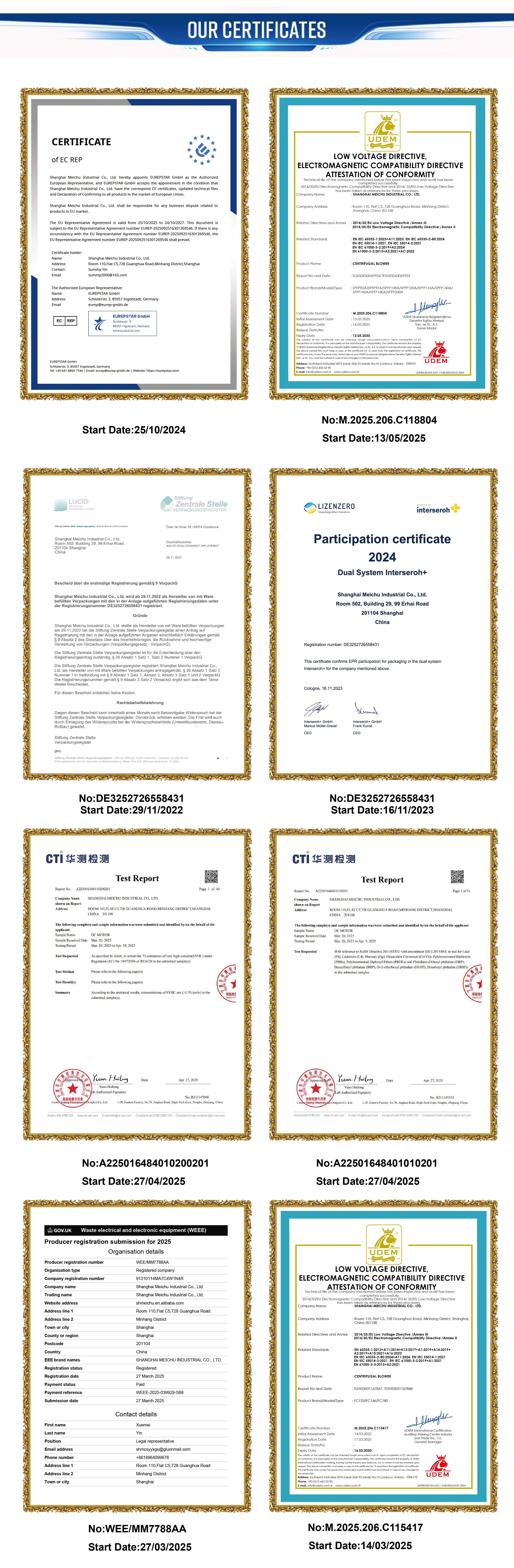 Shanghai Meichu has a well-managed complete quality control system, and our products meet the standards of CE, ISO 9001, UL,